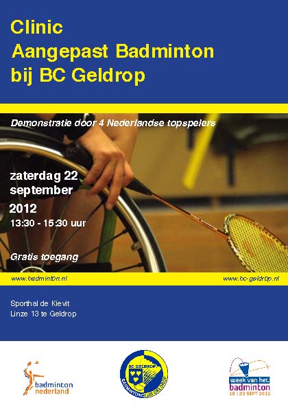 In het kader van de nationale week van het badminton, welke plaatsvindt van 18 tot 23 september 2012, is het BC Geldrop gelukt om 4 nationale rolstoelbadminton-toppers welke ook internationaal op het hoogste niveau meedraaien naar Geldrop te krijgen.