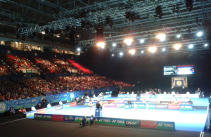 Na weer een busreis, kwamen we om vijf uur aan in de National Indoor Arena (NIA), ons tweede thuis voor het komende weekend. De kwartfinales zouden afgewerkt worden op drie banen en de eerste wedstrijden stonden op het punt van beginnen. We hadden mooie plaatsen. Maar na de eerste drie of vier wedstrijden, besloten we toch eens te proberen of het mogelijk was op die Reserved Seats, die nog betere plaatsen aan de overkant van de zaal, te gaan zitten. Dat bleek geen probleem, niemand lette op ons, en zo zaten we ineens op de beste stoelen uit het hele stadion. Prachtig!