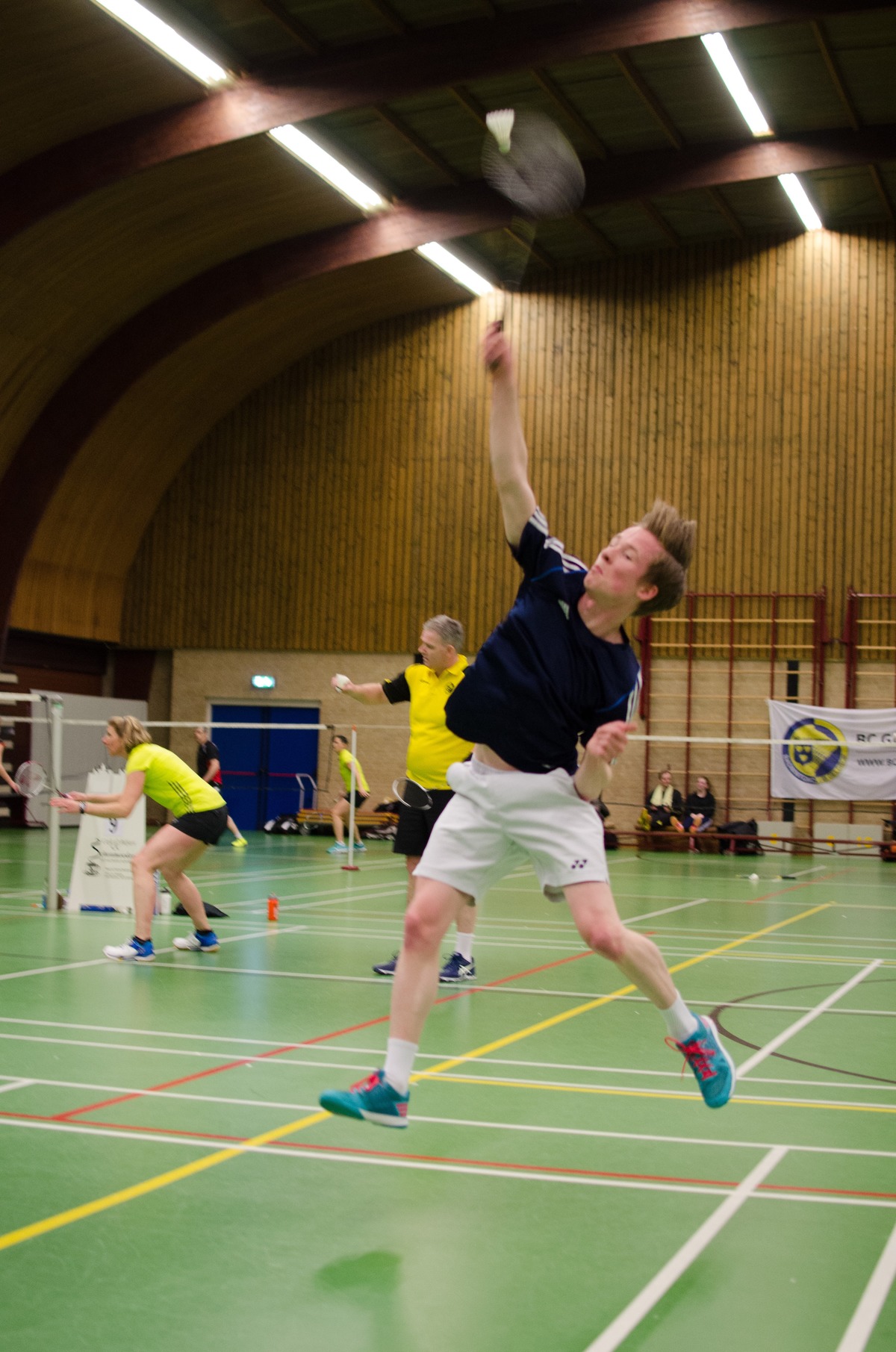 Na een korte nacht, de laatste zaterdagwedstrijd eindigde om 23:00 uur, stonden we op zondagmorgen om 8:30 uur voor een dichte sporthal. Uiteindelijk kwam de beheerder 10 minuten later aanscheuren en konden we alsnog beginnen aan dag twee. De trend van zaterdag werd meteen voortgezet, want meer dan de helft van de eerste wedstrijden ging over drie sets. Gelukkig hadden we de wedstrijden op deze dag wat ruimer ingeschat en liepen we de hele dag precies op schema. Soms heb je wat “hoofdpijn”-dossiers van spelers die ver komen en daardoor zichzelf en anderen in de weg kunnen zitten. Je kan nu eenmaal niet een halve finale herenenkel spelen en tegelijk een mixfinale en een halve finale herendubbel. Maar uiteindelijk, en soms tot opluchting van de organisatie, losten deze zaken zichzelf op en konden precies volgens planning de laatste finales om 17:00 uur de baan op. Dankzij de flexibiliteit van de beheerder, we hadden de zaal blijkbaar maar tot 17:00 uur gehuurd, hoefden we deze niet op de parkeerplaats te spelen maar kon dat gewoon op de banen 5 t/m 8.