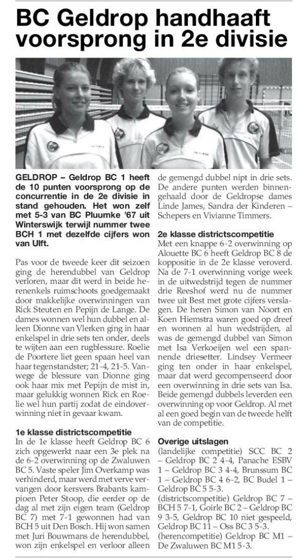 In de 1e klasse heeft Geldrop BC 6 zich opgewerkt naar een 3e plek na de 6-2 overwinning op de Zwaluwen BC 5. Vaste speler Jim Overkamp was verhinderd, maar werd met verve vervangen door kersvers Brabants kampioen Peter Stoop, die eerder op de dag al met zijn eigen team (Geldrop BC 7) met 7-1 gewonnen had van BCH 5 uit Den Bosch. Hij won samen met Juri Bouwmans de herendubbel, won zijn enkelspel en verloor alleen de gemengd dubbel nipt in drie sets. De andere punten werden binnengehaald door de Geldropse dames Linde James, Sandra der Kinderen – Schepers en Vivianne Timmers.