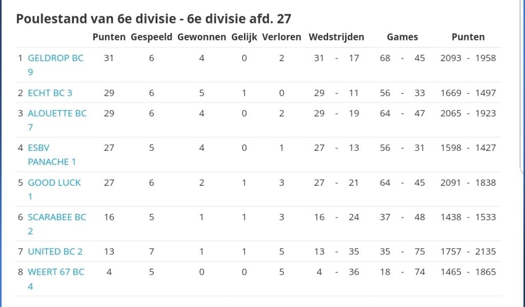 Wie voor dit weekend de tussenstand in de poule keek, zag dat BC Geldrop 9 de 5e plaats in hun poule in de 6e divisie bezette. De meer oplettende lezer ziet echter ook dat er kansen waren om de koppositie te over te pakken van BC Echt 3, die vijf partijen meer heeft gewonnen, maar één wedstrijd minder heeft gespeeld. Dit weekend werd er aangetreden tegen de nummer één-na-laatst; het tweede team van BC United uit Venlo.